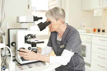 Dvs. mikroskopi af celleprøver fra især infektioner i hud og øregange. Blodprøver der udtages på klinikken sendes som oftest til eksternt laboratorium, hvor der er mulighed for dag til dag svar.